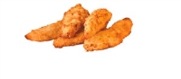 Large box of bite size portions of crispy chicken poppers served with a dip.