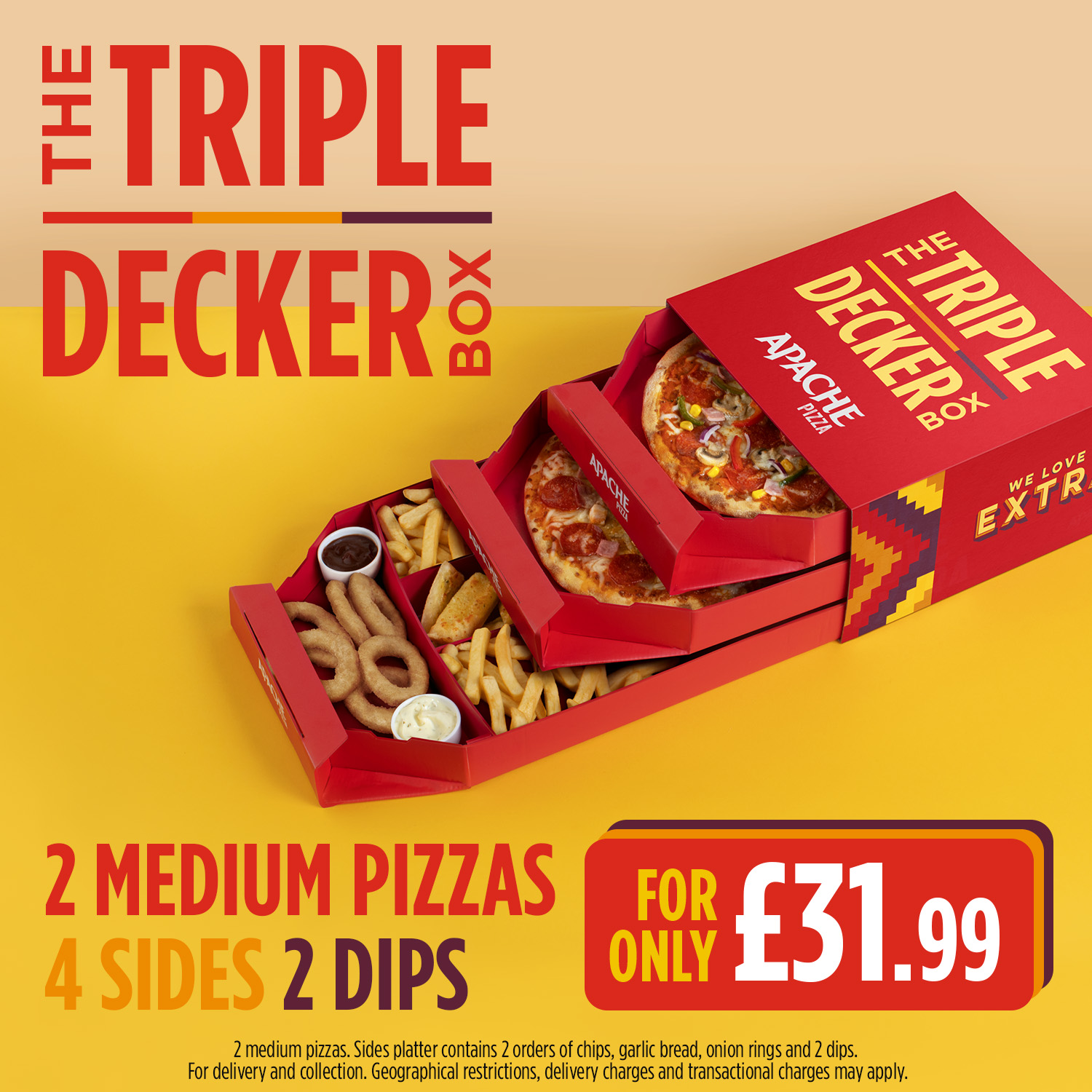 Triple Decker Treat Box with 2 medium pizza, treat box containing chips, garlic bread, onion rings, 3 cookies, a savoury & a sweet dip