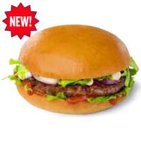 6 oz beef burger on a toasted brioche bun topped with lettuce & red onion.