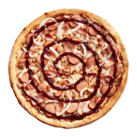 Pizza with BBQ sauce, double beefballs, sausage, red onion,bacon , BBQ drizzle and mozzarella cheese.