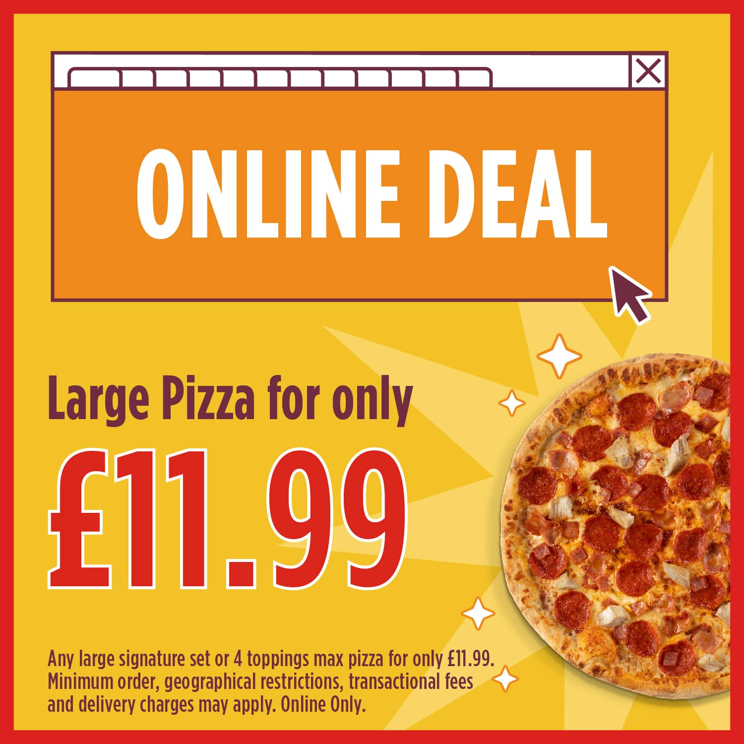 Game on Deal, any large set pizza or 4 toppings max, 4 dippers and wings, chips, 1 ltr drink and 2 dips